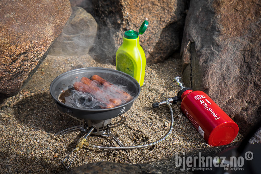 Pølsene ser ut til å bli gode å varme på Primus’en.